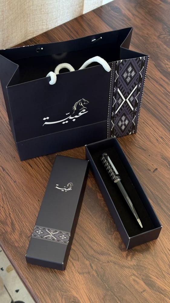 قلم يتميز بتداخل جميل بين اللون الأسود والتفاصيل الفضية المنقوشة، تصميم يعكس الدقة والذوق العالي.