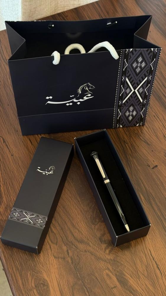 قلم رجالي أنيق بلونه الأسود الغامق ولمعته الجذابة، مزود بتفاصيل ذهبية تضيف له طابع ملكي.